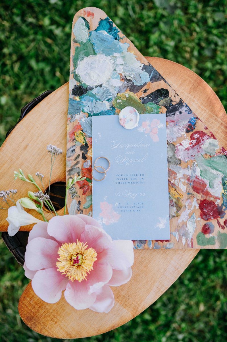 L'ispirazione impressionista nasce tutta da uno scatto che mi sono immaginata nel momento in cui ho pensato a quell'abito così esageratamente over: la musa dipinta dall'artista. Da lì hanno preso vita gli elementi di stile e quella mise en place per due da cui puoi prendere spunto per un matrimonio dedicato agli amanti dell'arte.