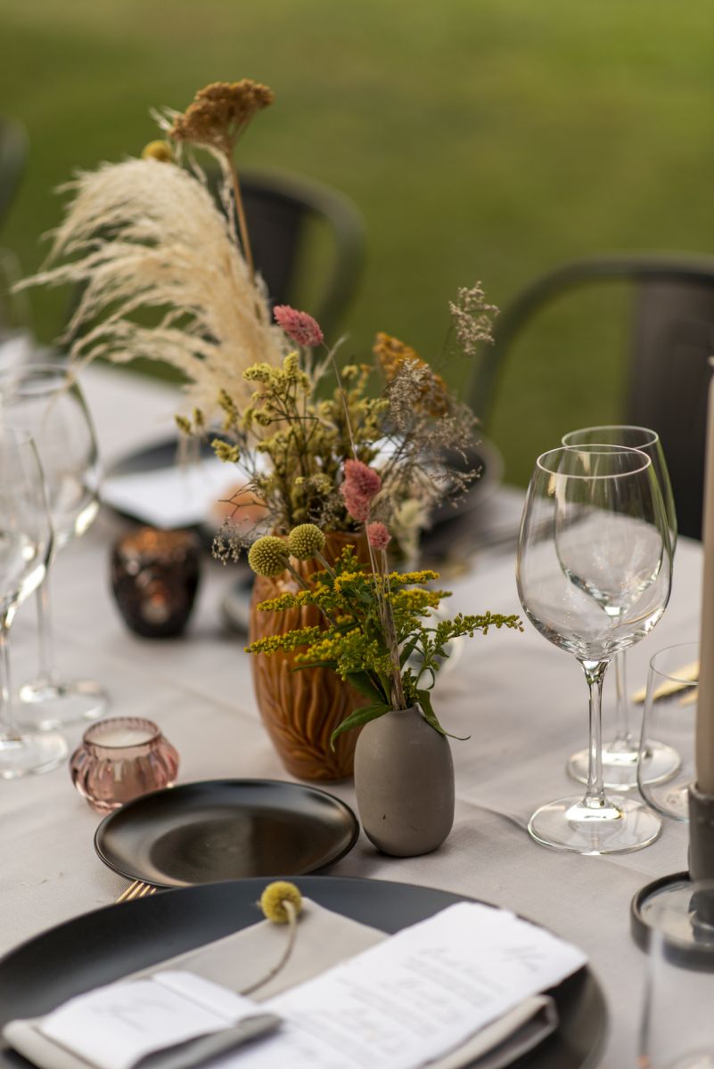 Senza rinunciare alla poesia, lo stile di questo matrimonio è contemporaneo e deciso, anche grazie ai materiali utilizzati. Tutti gli elementi della stationery, ad esempio, sono stati realizzati in carta artigianale, fatta a mano, le superfici erano quindi texturizzate, materiche, con bordi irregolari. I piatti neri in ceramica e le sedie in metallo hanno sicuramente aiutato a conferire forza al progetto.
